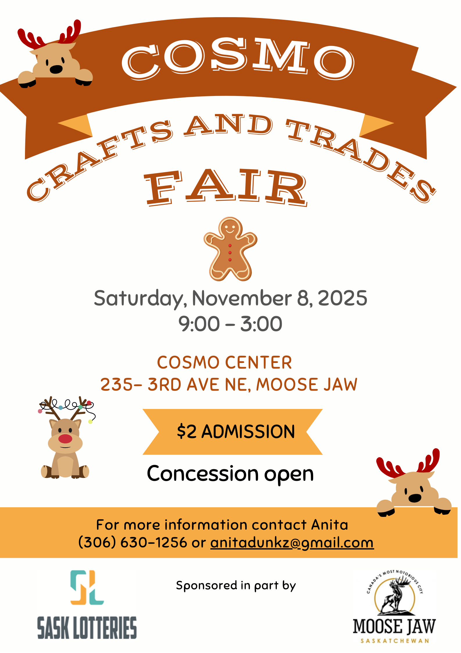 November 8 - Cosmo Centre Crafts and Trades Fair, 9:00am - 3:00pm, Admission $2/person