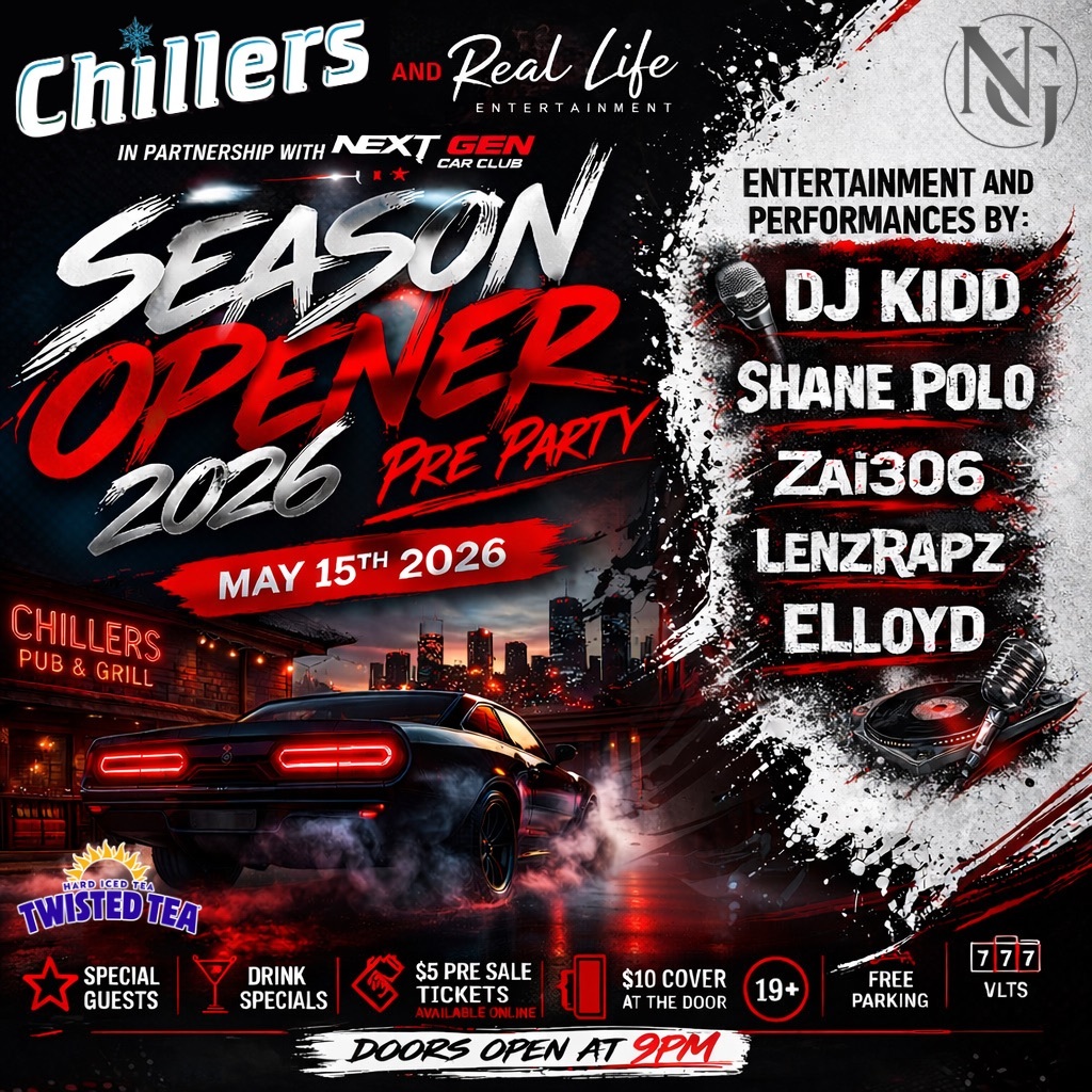 Real Life Entertainment, Chillers Pub, and Next Gen Car Club team up to bring you an unforgettable night of fun to kick off the 2026 Next Gen car season! This night will not disappoint. We have a wide range of entertainment lined up for the night. A door prize, special guests, drink specials, live performances, dedicated DJ, slot machines, and much more! You won’t want to miss this event and tickets are selling fast, so get yours for only $5.00 while supplies last at eventbrite.ca!