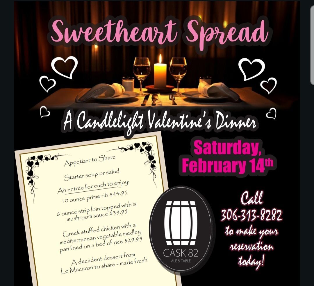 Join us for our Valentine's Sweetheart Spread! Saturday, February 14th. Special menu and feature cocktails. Call 306-313-8282 to reserve before it's too late!