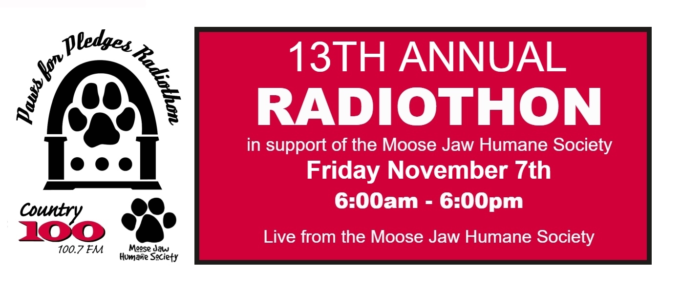 Join us for our 13th Annual Paws For Pledges Radiothon on Friday, November 7th, broadcasting live on Country 100 from the Moose Jaw Humane Society 6 am- 6 pm.