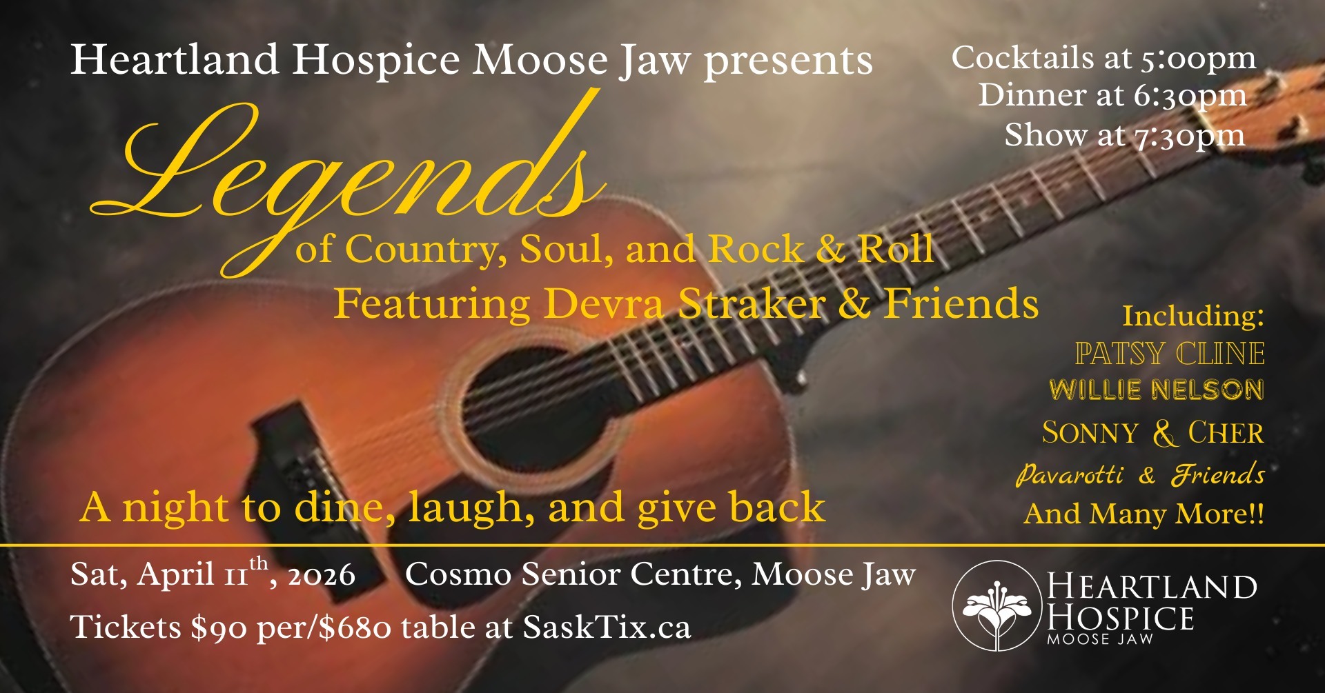 Join Heartland Hospice Moose Jaw for a fabulous night with Devra Straker and Friends, featuring unforgettable songs by legends of country, soul, and rock ’n’ roll. Enjoy favourites from Patsy Cline, Willie Nelson, Sonny and Cher, and many more!