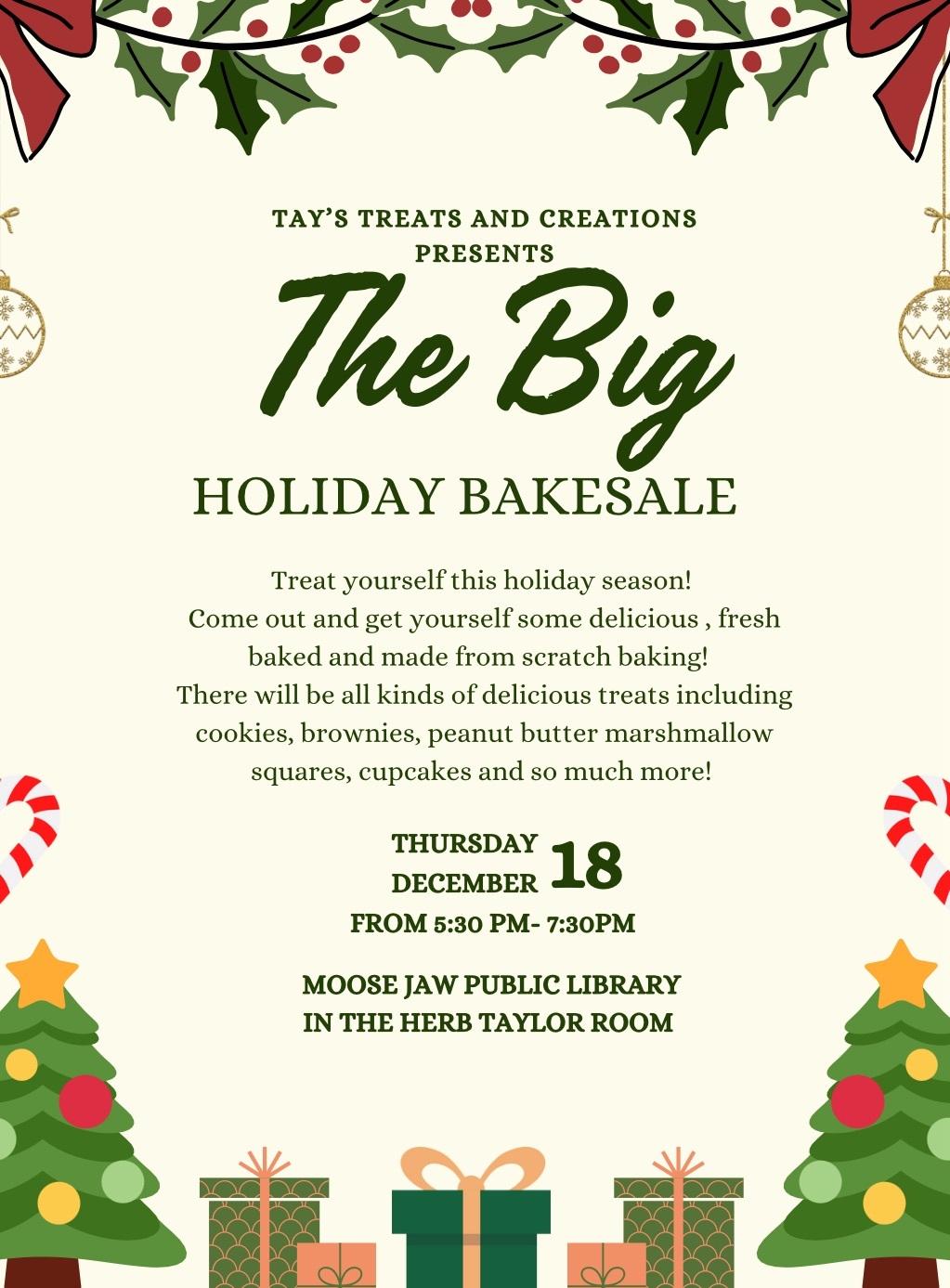π£π£π£ MARK YOUR CALENDARS π£π£π£ πTHE BIG HOLIDAY BAKESALEπ WHEN: Dec 18 From 5:30-7:30 WHERE: Moose Jaw Public Library in the Herb Taylor Room