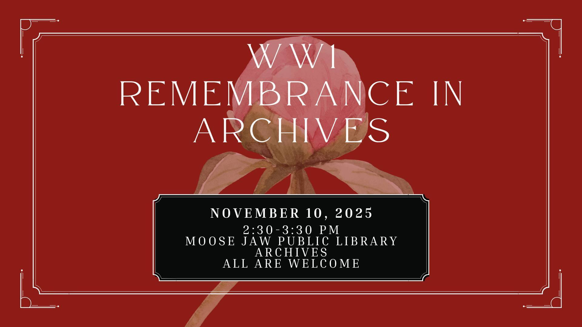 Join us and explore materials we have pulled from the Archives records related to WWI history in and around Moose Jaw. There will be photos, documents, and more to view! Attendees can also feel free to inquire about anything else we may hold in the Archives!